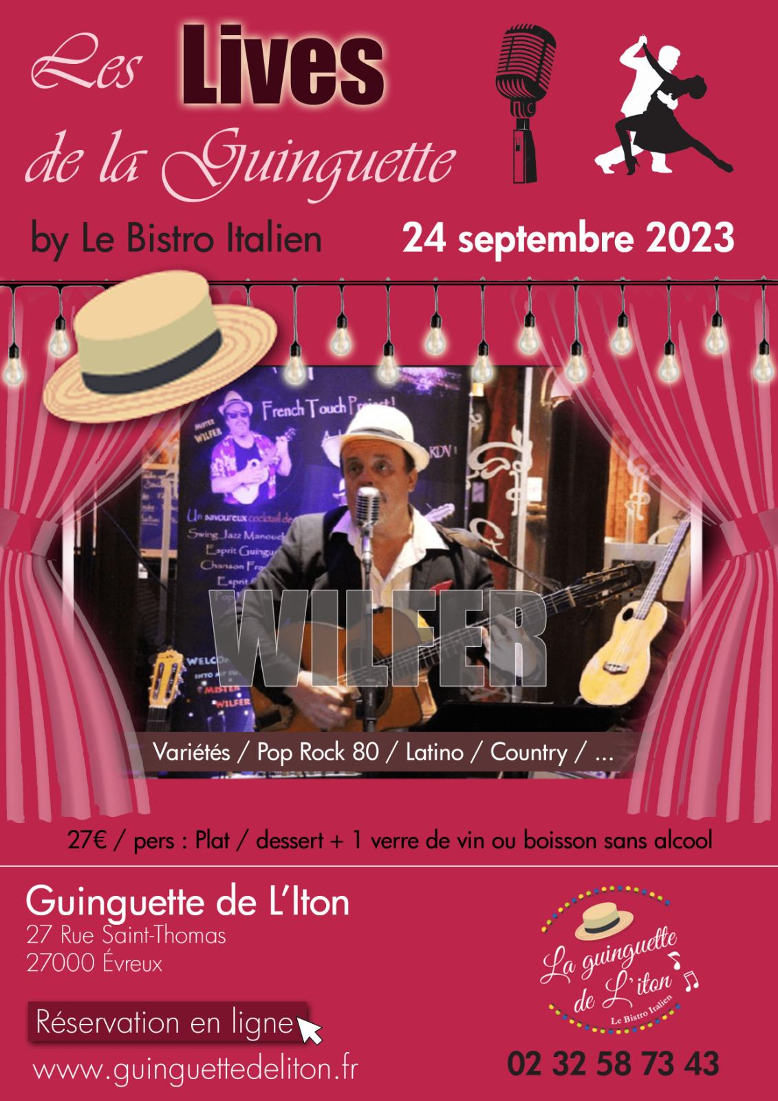 Voici toutes les informations sur le Restaurant dansant Guinguette de L’Iton evreux qui ce trouve au 27 Rue Saint-Thomas, 27000 Évreux (27). Sur cette fiche vous trouverez les photos, l'adresse, les horaires d'ouverture, le numero de téléphone et les avis clients.Vous pouvez églement rédiger un avis si vous le souhaitez en bas de page.